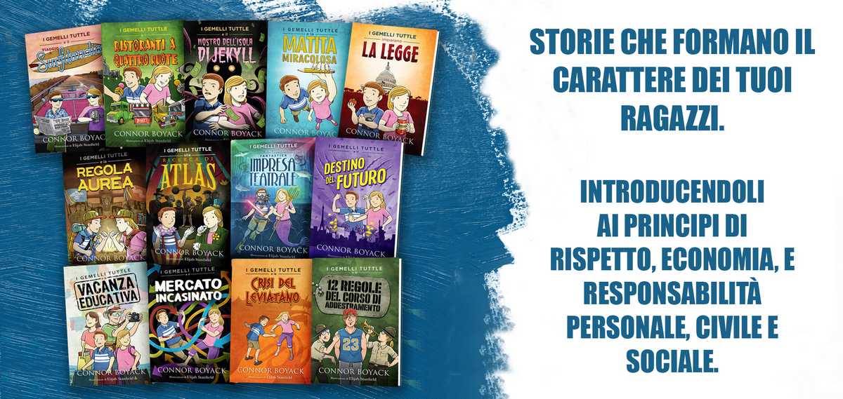 Il costo di NON avere questi libri Non insegnare queste idee ai bambini ha un costo molto elevato per la società intera: i nostri figli cresceranno, diventeranno adulti e un giorno avranno la possibilità di votare. Le persone ignoranti eleggono le persone sbagliate e in questo modo contribuiscono a sostenere quelle leggi che restringono le nostre libertà e soffocano la libera impresa. Inoltre, cosa ancora peggiore, non hanno alcuna conoscenza dei principi che potrebbero migliorare la vita di tutti. Una soluzione esiste, ma richiede che i genitori come te e me investano parte del proprio tempo a insegnare le buone idee economiche ai propri figli quando sono ancora piccoli. È nostro compito! dobbiamo essere NOI i primi a fornire loro le fondamenta per una vita sana fondata sul concetto di libertà. |